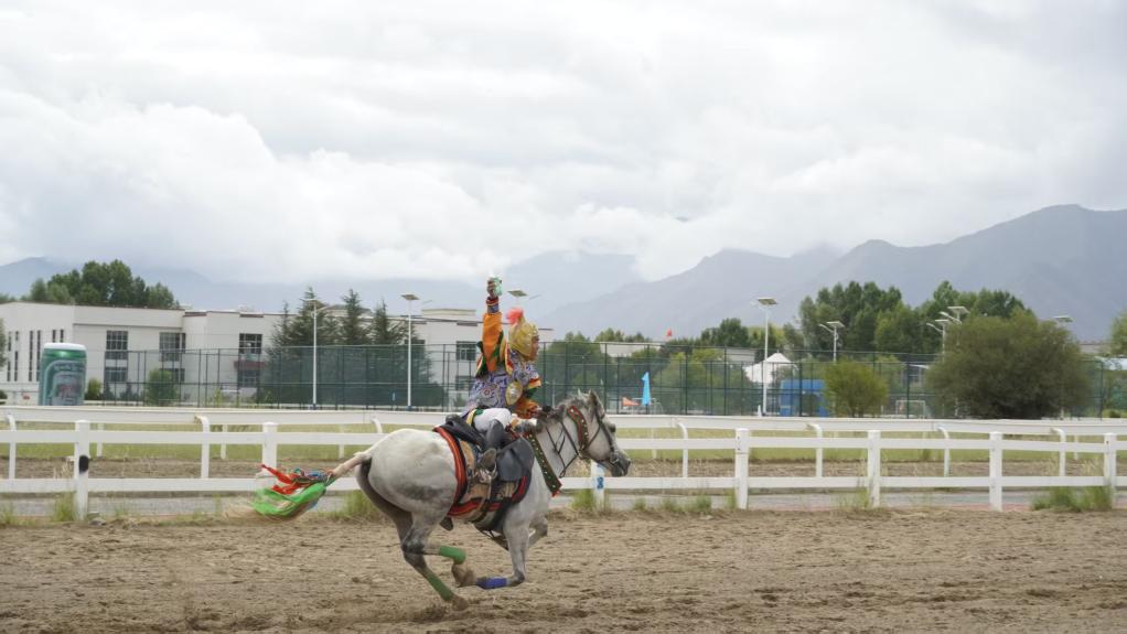 8月24日,西藏自治區(qū)馬術(shù)隊隊員旦增尼瑪在進(jìn)行“馬上敬酒”表演。 新華社記者 黃耀漫 攝