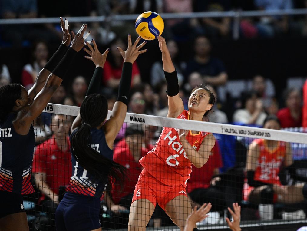 8月27日,中國隊球員吳夢潔(上)在比賽中扣球。新華社記者 侯昭康 攝