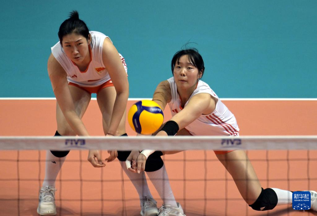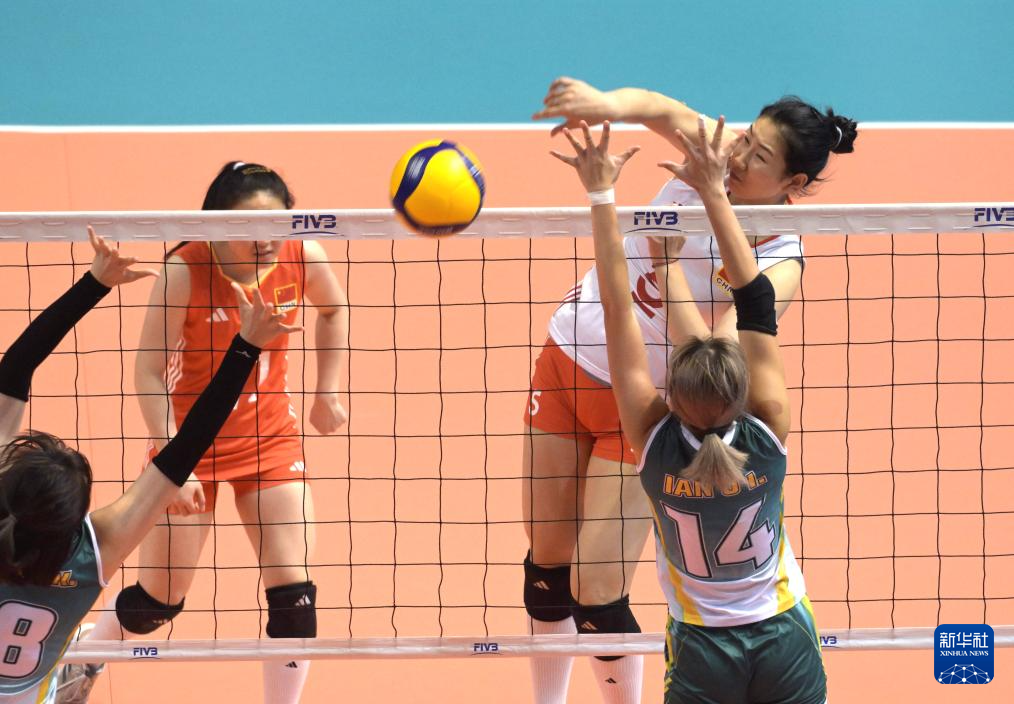 8月28日,中國隊(duì)球員黃怡維(右一)在比賽中扣球。新華社發(fā)(盧炳輝攝)