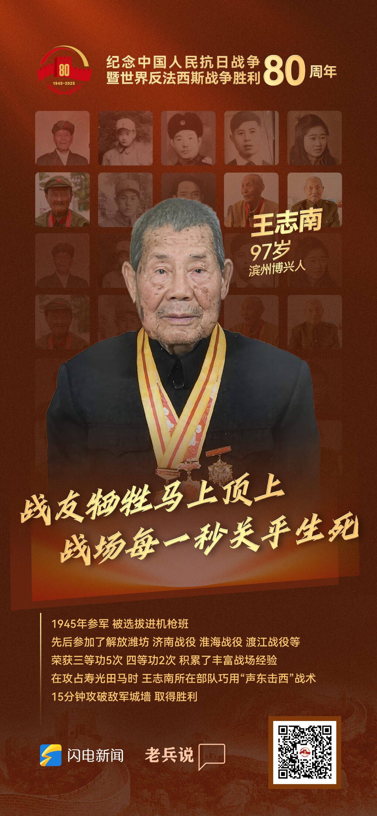 齊魯網(wǎng)·閃電新聞9月1日訊 為紀(jì)念中國(guó)人民抗日戰(zhàn)爭(zhēng)暨世界反法西斯戰(zhàn)爭(zhēng)勝利80周年,山東省委網(wǎng)信辦、山東省退役軍人事務(wù)廳、齊魯網(wǎng)·閃電新聞策劃推出“致敬!老兵”系列人物海報(bào),今天走近“戰(zhàn)友犧牲馬上頂上,戰(zhàn)場(chǎng)每一秒關(guān)乎生死——王志南”。