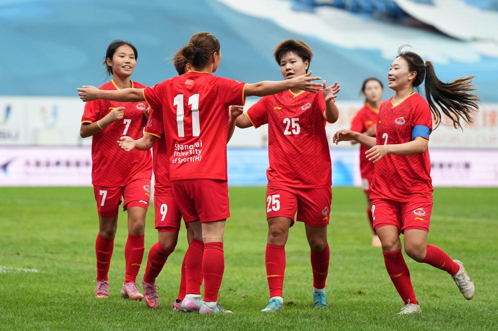 9月17日,上海體育大學女足球員慶祝進球。新華社記者 鄭煥松 攝