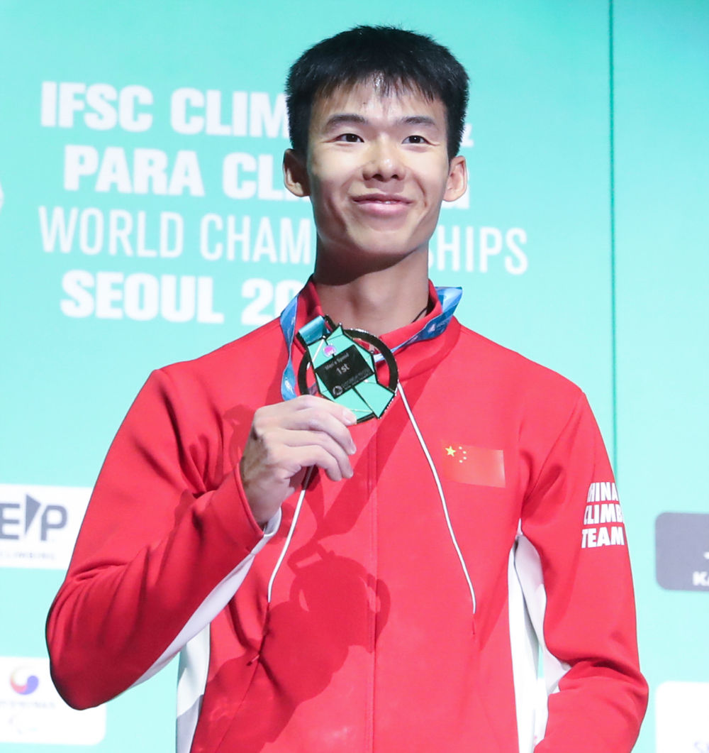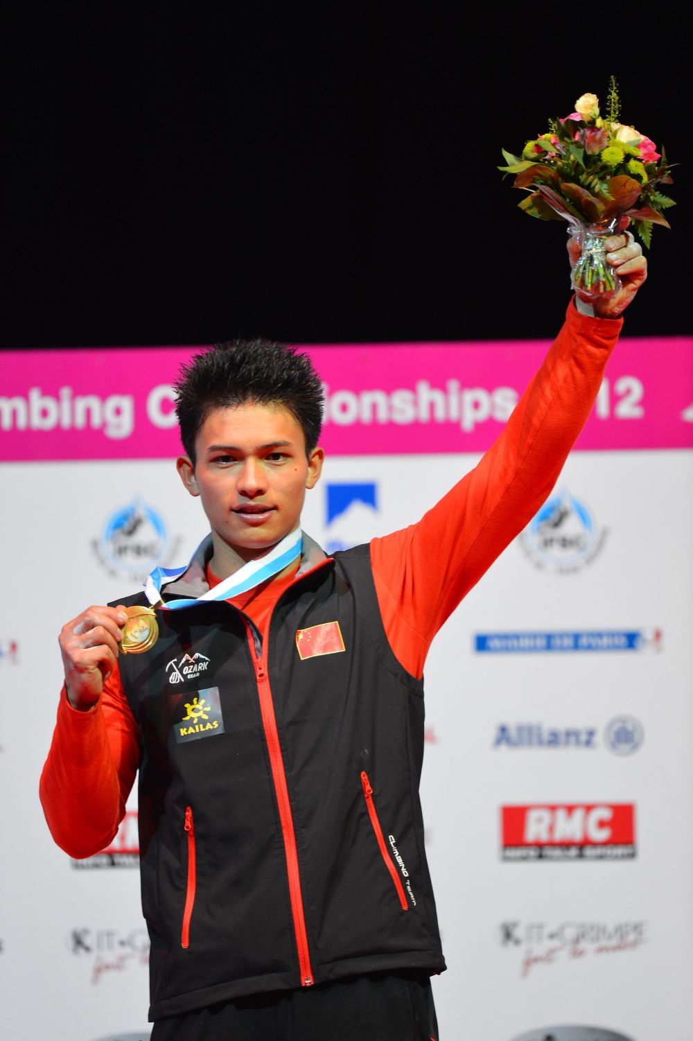 2012年9月16日,中國選手鐘齊鑫在領(lǐng)獎(jiǎng)臺(tái)上。當(dāng)日,在巴黎舉行的世界攀巖錦標(biāo)賽男子速度賽決賽中,鐘齊鑫奪得冠軍。新華社發(fā)