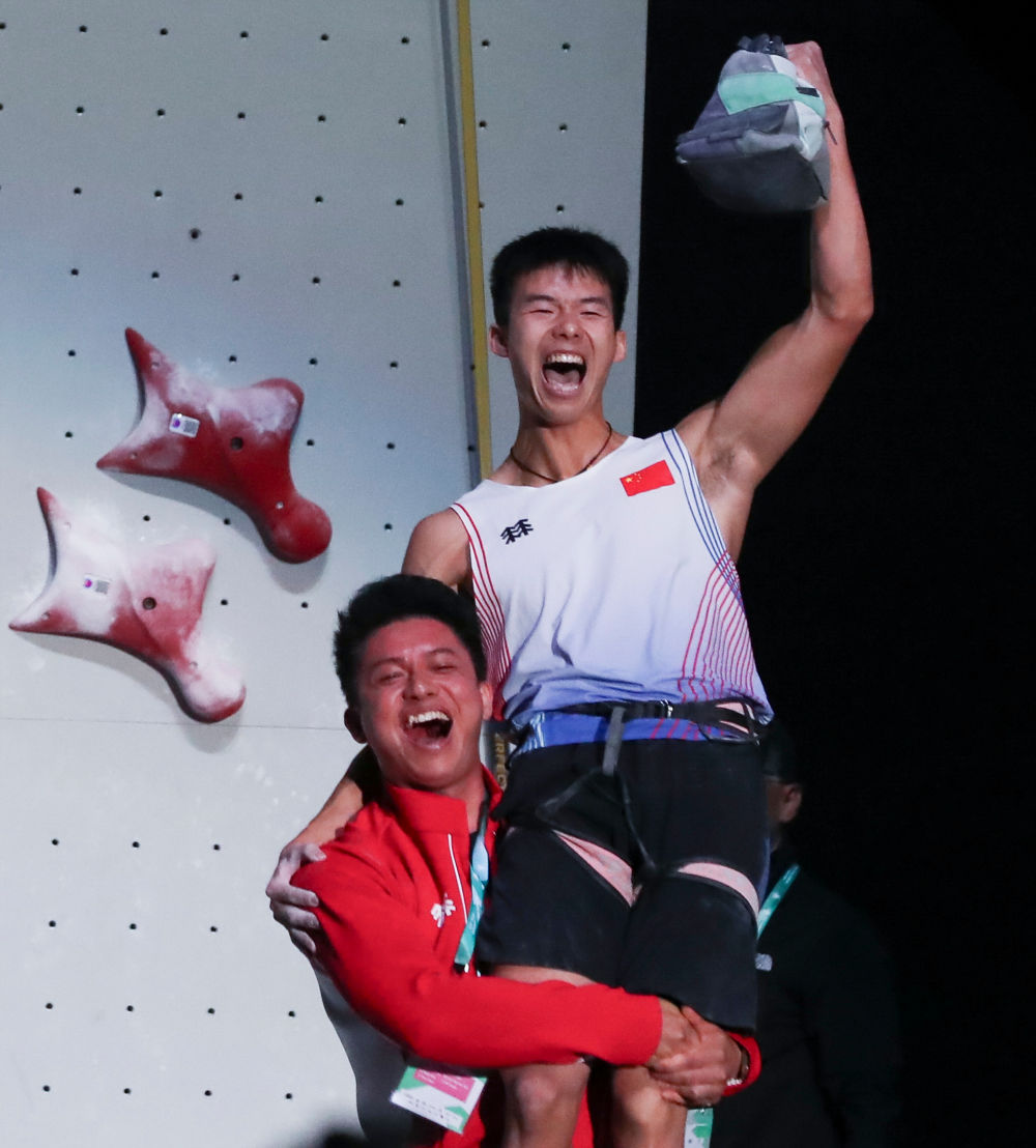 “非常激動(dòng),確實(shí)剛才就是有點(diǎn)情不自禁,沖上去就把見國抱起來。因?yàn)榻K于中國隊(duì)的運(yùn)動(dòng)員在世錦賽上又拿到了這個(gè)成績。我們整個(gè)團(tuán)隊(duì)都非常團(tuán)結(jié),也感謝所有人對(duì)中國速度攀巖的支持?!鄙陨云届o后,鐘齊鑫說。