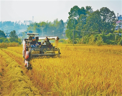 10月12日,在安徽省安慶市岳西縣溫泉鎮(zhèn),農(nóng)機(jī)手駕駛收割機(jī)收割水稻。 吳均奇攝(影像中國(guó))