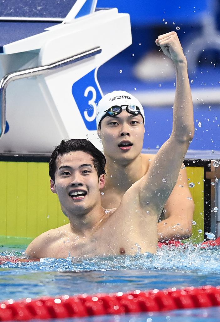 2023年9月27日,韓國選手黃宣優(yōu)(前)在杭州亞運(yùn)會(huì)游泳項(xiàng)目男子200米自由泳決賽后慶祝奪冠。新華社記者 黃宗治 攝