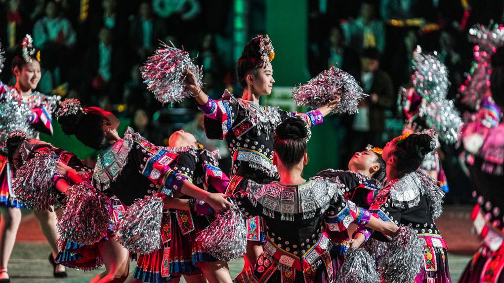 4月13日,演員在啟動(dòng)儀式上進(jìn)行歌舞表演。當(dāng)日,大地流彩·2025年全國和美鄉(xiāng)村籃球大賽(村BA)啟動(dòng)儀式在貴州省黔東南苗族侗族自治州臺(tái)江縣臺(tái)盤村舉行。新華社記者 陶亮 攝