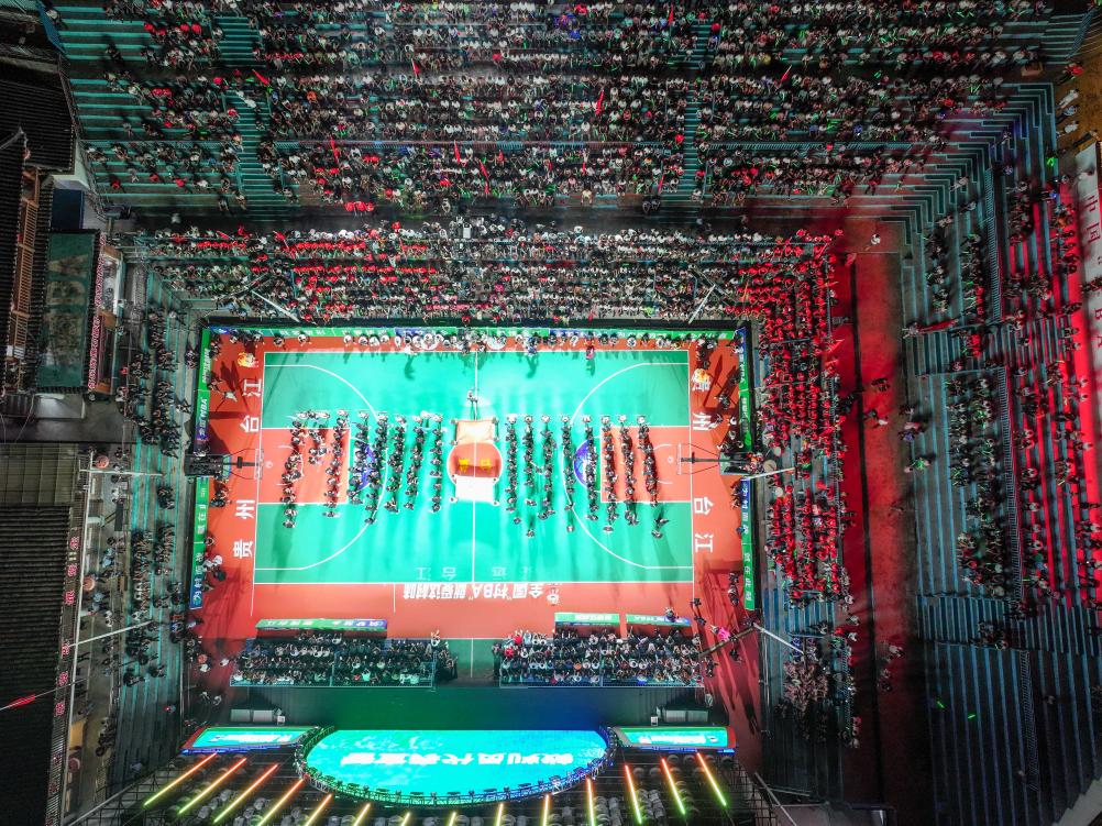 這是2024年6月9日拍攝的全國民族團(tuán)結(jié)籃球邀請(qǐng)賽現(xiàn)場(chǎng)(無人機(jī)照片)。當(dāng)日,第十二屆全國少數(shù)民族傳統(tǒng)體育運(yùn)動(dòng)會(huì)“同心暢享”系列活動(dòng)之一的全國民族團(tuán)結(jié)籃球邀請(qǐng)賽在貴州省黔東南苗族侗族自治州臺(tái)江縣臺(tái)盤村開賽。揭幕戰(zhàn)在貴州道真隊(duì)和河北寧晉隊(duì)之間展開。新華社發(fā)(龍建睿攝)