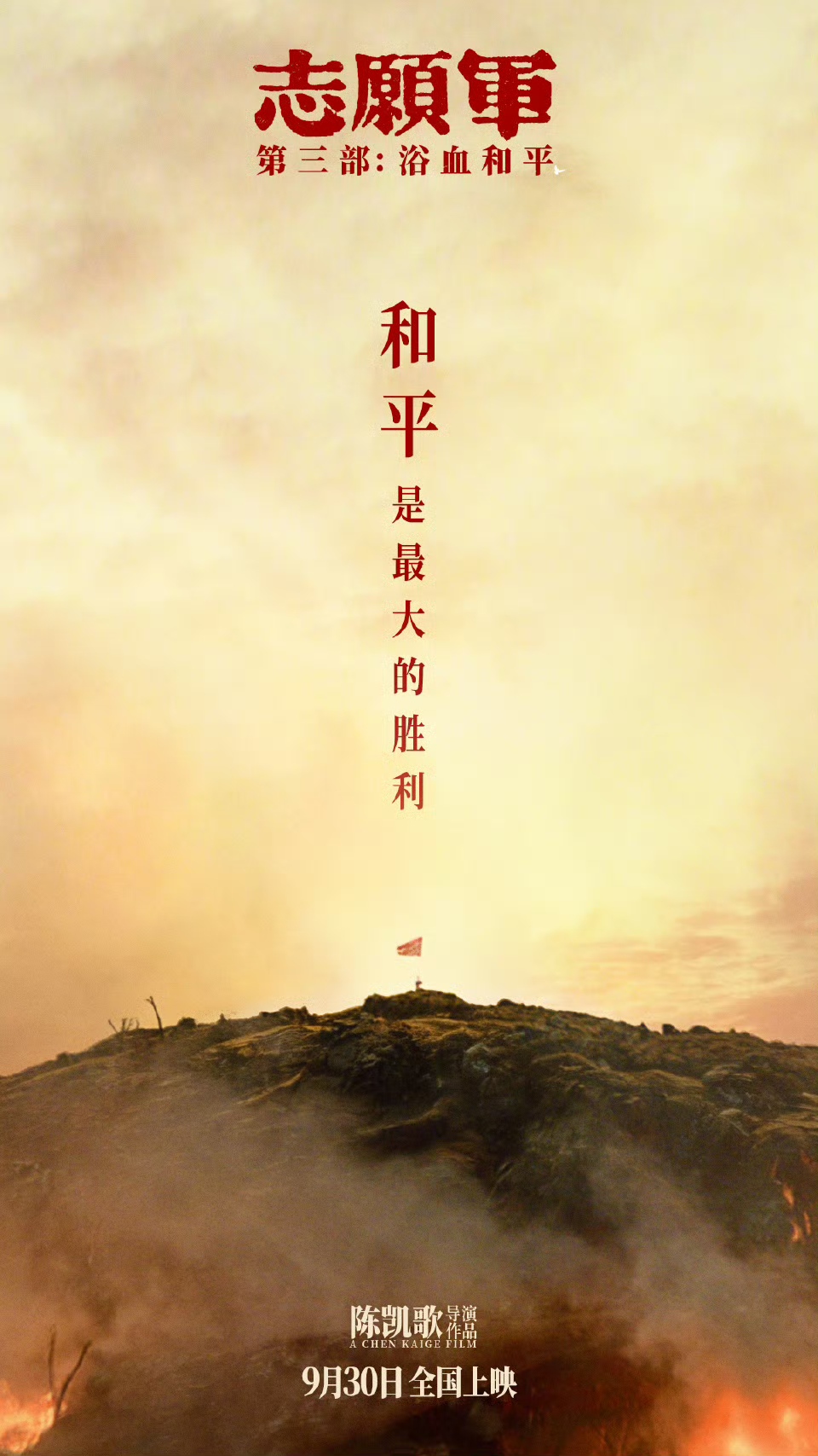 “和平就是最大的勝利。”電影今日官宣預(yù)售開啟,此前在國際和平日發(fā)布的“和平曙光”新媒體海報中,飄揚的戰(zhàn)旗在陣地上傲然屹立,無聲訴說著志愿軍戰(zhàn)士們所有的沖鋒與堅守,都是為了“和平”這個最崇高的信念。這面旗幟既象征著前線戰(zhàn)士們用鮮血贏來的勝利,更象征著無數(shù)先烈用生命鑄就的和平未來?!吨驹杠姟啡壳盗信惆橛^眾走過三年時光,全景式記錄了抗美援朝從出兵作戰(zhàn)到最終迎來和平的崢嶸歷程,而每一位觀眾也透過光影與一個個英雄角色相遇、告別。前兩部戰(zhàn)爭場面的震撼與人物情感的細(xì)膩打動了不少觀眾,如今電影預(yù)售已全面開啟,三部曲迎來最終章。