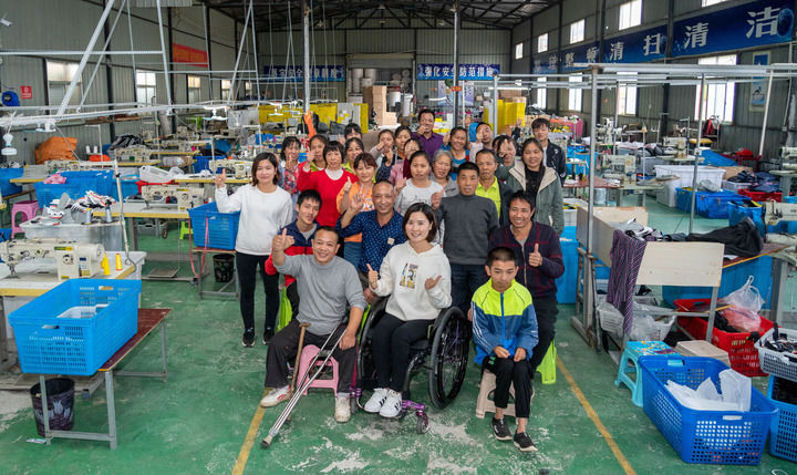 2020年10月13日,在湖南省邵陽市城步縣湖南七七科技股份有限公司生產(chǎn)車間,楊淑亭(前排中)與工友合影。新華社記者 才揚 攝