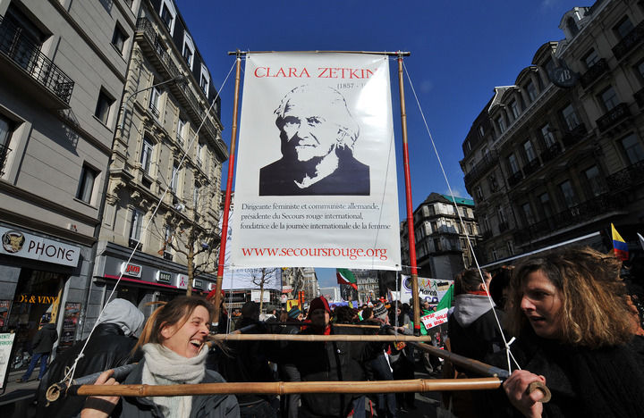 2010年3月6日,在比利時首都布魯塞爾,婦女代表抬著著名女政治活動家、三八國際婦女節(jié)的倡導(dǎo)者克拉拉·蔡特金的畫像參加慶祝三八國際勞動婦女節(jié)游行。新華社記者 武巍 攝