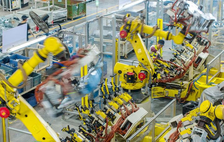 2025年10月9日,浙江省湖州市長興經(jīng)濟(jì)技術(shù)開發(fā)區(qū)一家汽車部件有限公司的技術(shù)人員操控工業(yè)機(jī)器人生產(chǎn)新能源汽車配件(無人機(jī)照片)。新華社發(fā)(譚云俸攝)