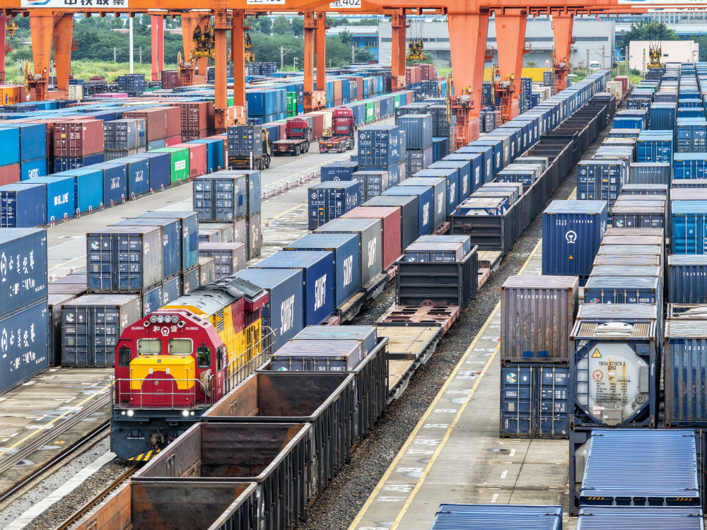 2025年9月8日,滿載“重慶造”汽車的中歐班列(成渝)在重慶團結(jié)村中心站等待發(fā)車(無人機照片)。新華社記者 唐奕 攝