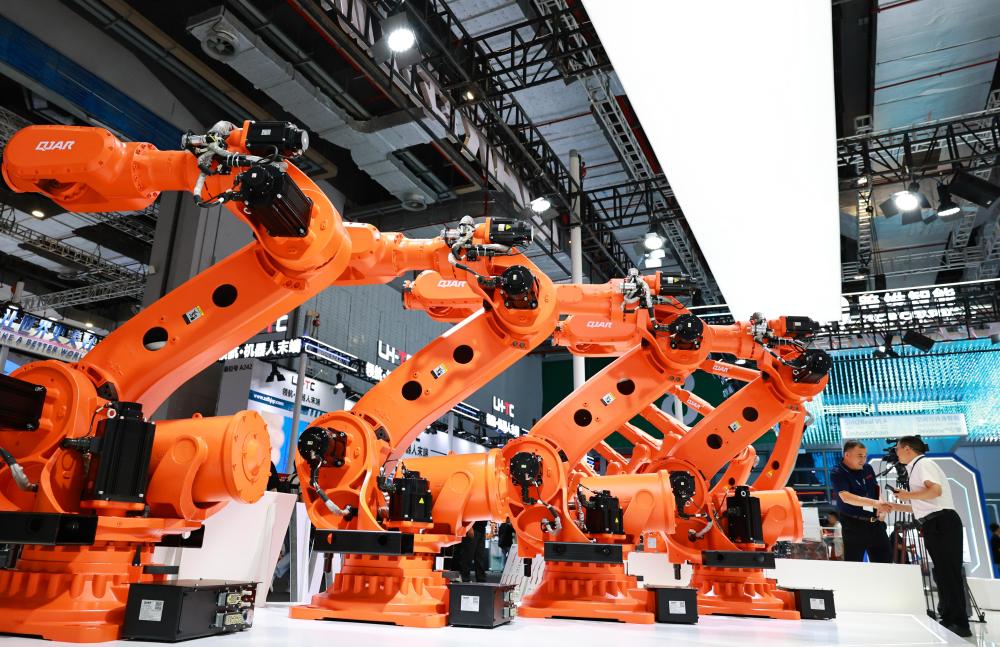 這是2025年9月23日在上海舉行的第25屆中國國際工業(yè)博覽會上拍攝的一組大型工業(yè)機器人產(chǎn)品。新華社記者 方喆 攝